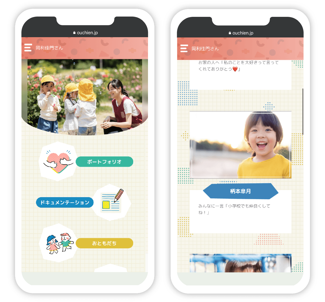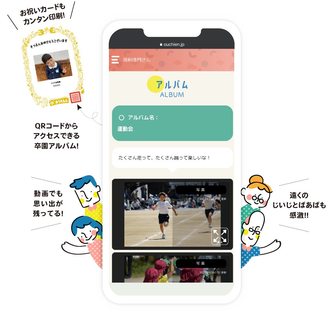 離れた家族への共有もURLや二次元バーコードでラクラク。卒園後の成長の記録も行えます。